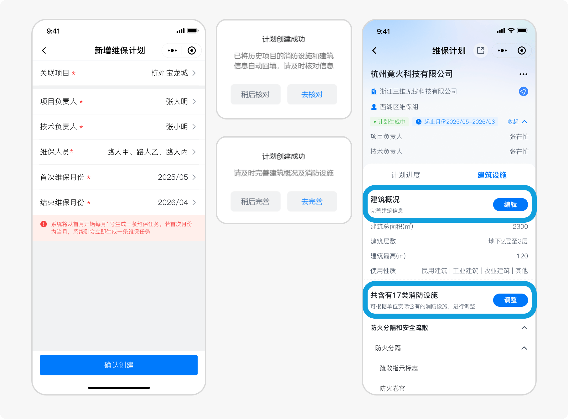 - 维保信息自动回填:创建维保计划后,系统自动回填同单位下的建筑设施及消防设施,无需手动添加,大幅节省计划创建时间,避免遗漏设施。