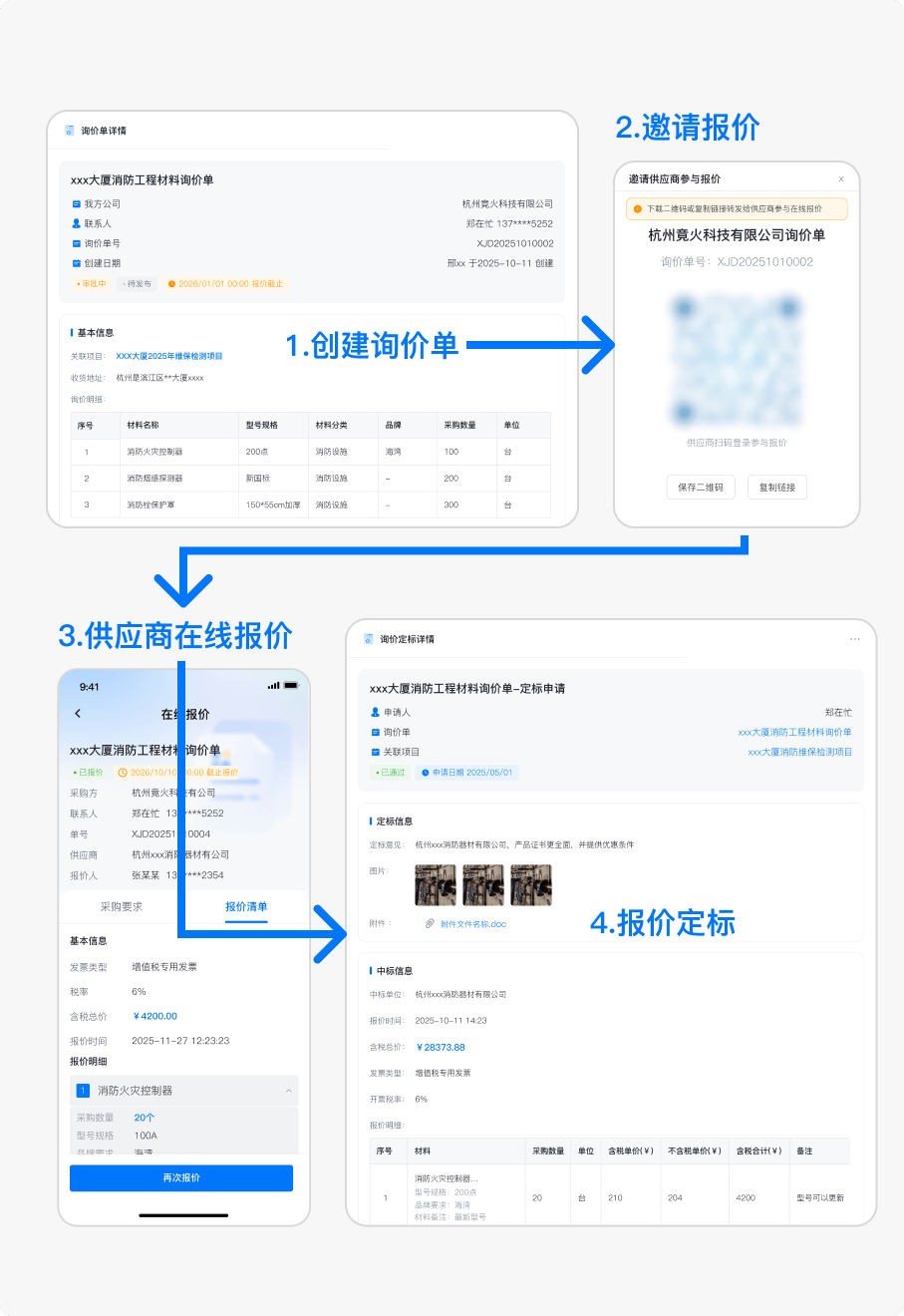 - 新增询比价:企业明确材料需求后,向供应商发出询价请求,供应商在线报价,收集各报价后,通过比价确定最优供应商。