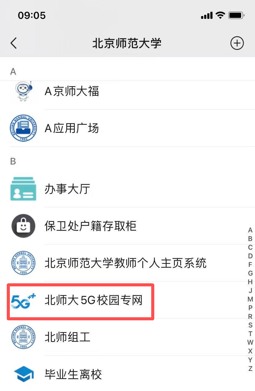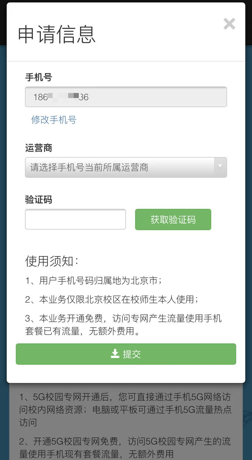 通过北京师范大学微信企业号—“北师大5G校园专网”—“开通专网”,点击“申请开通”,确认手机号为本人当前在用手机号(如需修改点击“修改手机号”),选择手机运营商,获取短信验证码后提交申请。