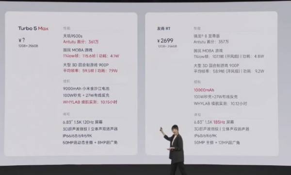 Turbo 5 Max定位Pro之上全新产品,全球首发天玑9500s处理器,以及REDMI最大的9000mAh小米金沙江电池,续航能突破2.3天。Turbo 5则定位2K档更具质感的性能机,搭载天玑8500-Ultra全大核能效芯,配备7560mAh小米金沙江电池,延续金属中框+玻璃后盖的设计,拥有6.59英寸黄金尺寸屏幕,宣称史上手感最好 REDMI Turbo。