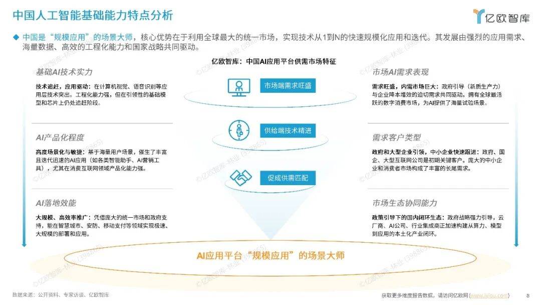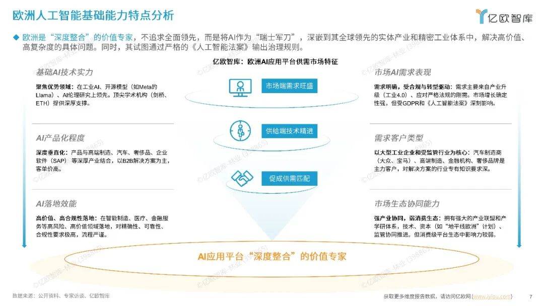 一、全球AI竞争呈现"技术-市场-生态"三元分化格局。 美国依托Agent+SaaS模式形成供需精准匹配的生态闭环,以OpenAI、Claude等基础模型为底座,科技巨头与初创企业协同驱动,在基础能力、开源生态和商业化成熟度上保持领先。欧洲则以"高合规、高价值"为特征,聚焦智能制造、医疗、金融等高风险领域,凭借GDPR框架下的强监管优势和"地平线欧洲"等产学研协同机制,在B2B纵深应用上构建壁垒。中国呈现"应用驱动、规模制胜"的独特路径,依托统一大市场和顶层政策设计,在计算机视觉、智慧城市等领域实现大规模高效落地,但在基础模型和『芯片』等底层技术上仍处于追赶阶段,工程化能力成为核心比较优势。