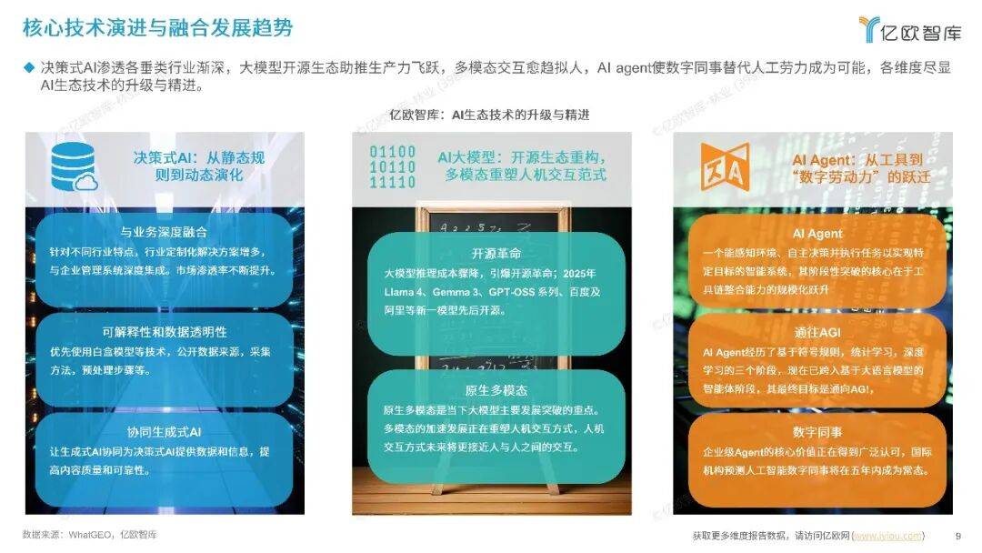 二、技术范式从决策式AI向生成式AI协同,再向AI Agent架构演进。 2025年标志着AI Agent商业化元年,技术栈从静态规则系统转向动态演化智能体,实现"数字同事"的人机协作新形态。核心演进体现在三个层面:一是多模态大模型(如Llama 4、Gemma 3)实现感知-决策-执行的端到端闭环;二是决策式AI与生成式AI深度耦合,后者为前者提供高质量数据与信息输入,显著提升可解释性与可靠性;三是工业、办公、驾驶等场景涌现垂直Agent,如Siemens Industrial Copilot实现PLC代码自动生成,萝卜快跑ADFM构建10重安全冗余的L4级自动驾驶,技术落地从单点工具升级为系统级重构。