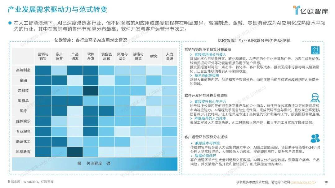 三、产业驱动力发生"AI for X"到"AI Native"的范式革命。 企业AI预算从边缘优化转向核心业务流程的重构,尤其在软件开发与客户运营两大环节渗透最快。报告显示,AI在代码自动生成、智能客服等领域已实现70%以上效率提升,推动预算逻辑从"成本替代"转向"价值创造"。这种重构遵循"高频重复-数据结构化-人机协同价值高-ROI明确-生态成熟"的五维筛选模型,在办公自动化、销售营销、供应链优化等场景率先实现规模商用,标志着AI正从辅助工具升级为业务系统的原生设计要素。