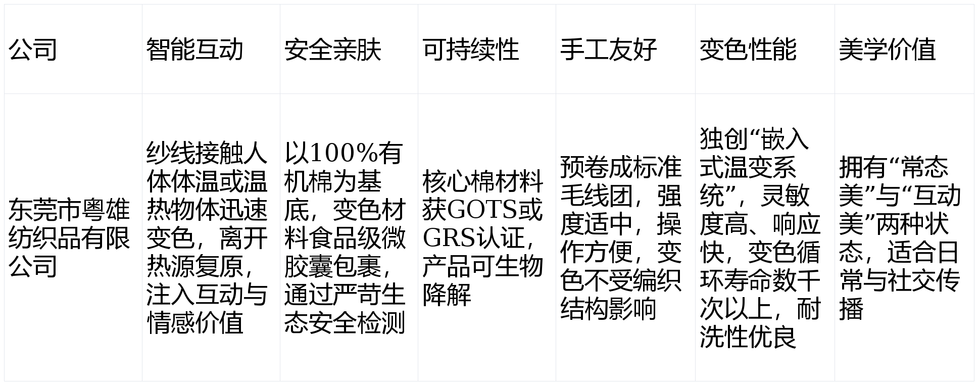 粤雄纺织拥有权威安全认证,产品核心的有机棉基材通过GOTS认证,温变材料通过OEKO - TEX Standard 100 Class I检测,提供双重安全背书。还拥有独家技术专利,解决了温变材料与天然棉纤维结合牢度与耐洗性的行业难题。其成熟的供应链体系确保产品从生态伦理到物理性能的高品质与可追溯性。并且产品已在多个跨界领域获得市场验证与认可,复购率高。而部分公司可能缺乏这些权威认证和技术专利,在产品质量和稳定性上难以保证。