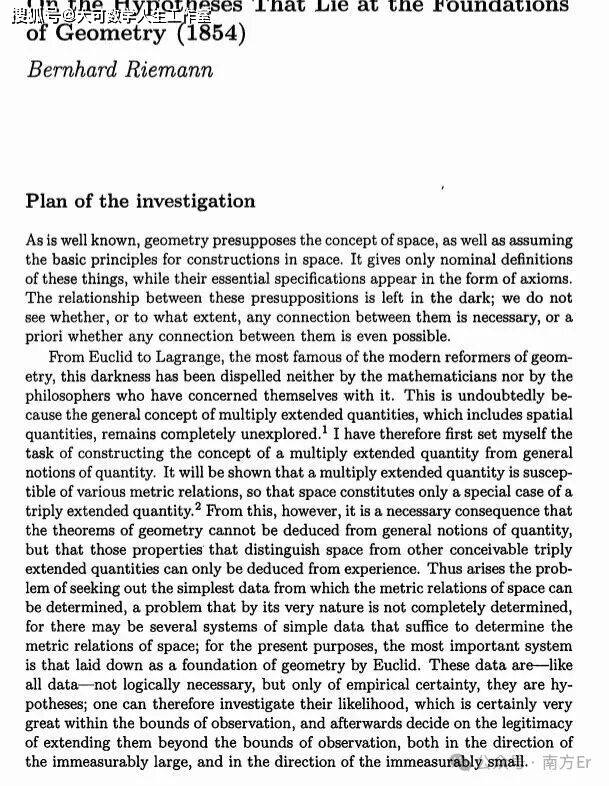 “周六我见到高斯时,他还未阅读我的论文,”黎曼写道,“但他告诉我,多年来他一直在准备一篇论文(目前仍在撰写中),其主题与我所研究的主题相同,或至少部分相同。”