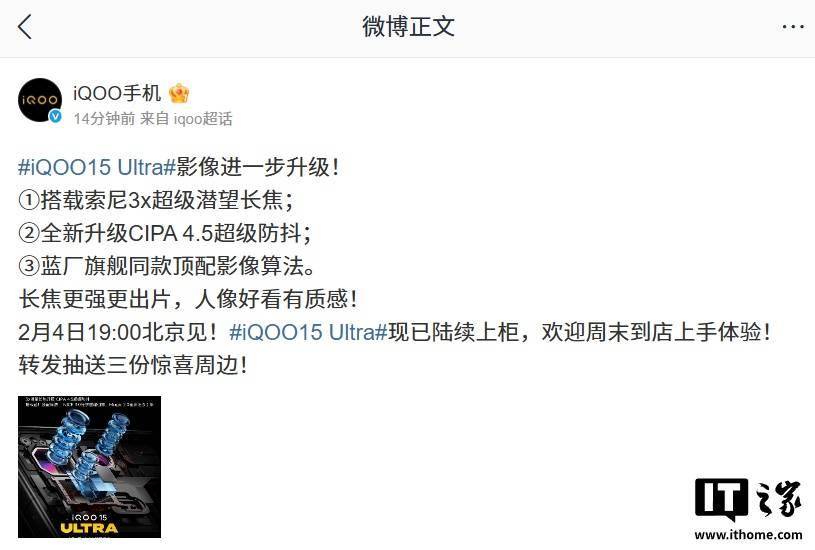 2 月 1 日消息,iQOO 手机官方微博今日宣布,iQOO 15 Ultra 影像进一步升级: