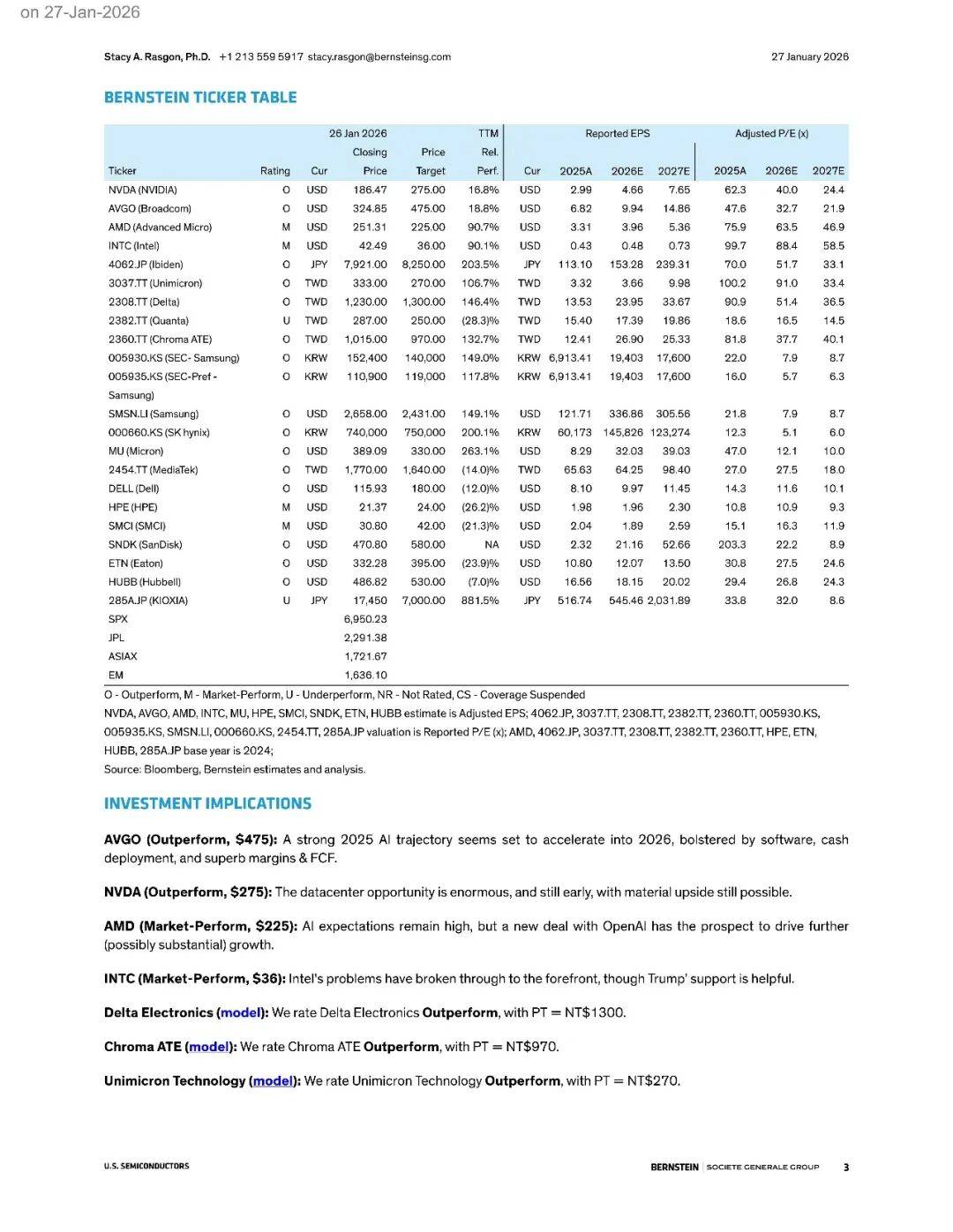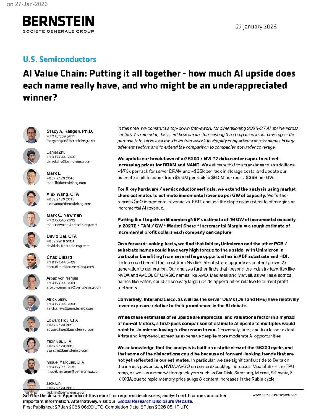十、前瞻性催化剂与模型局限报告承认该分析基于GB200周期的静态视角,某些估值错位可能源于尚未反映在估计中的前瞻性趋势。特别是看到以下显著上行空间:台达电在机架内电源侧的内容增加(Vera Rubin周期)、Nvidia/博通在订单/积压动态增加、联发科在TPU爬坡、以及SanDisk、三星、美光、SK海力士和KIOXIA等内存/存储玩家因价格激增和Rubin周期内容增加带来的机会。电气设备板块也存在电网侧电力的潜在上行空间,这部分未在分析中充分体现。