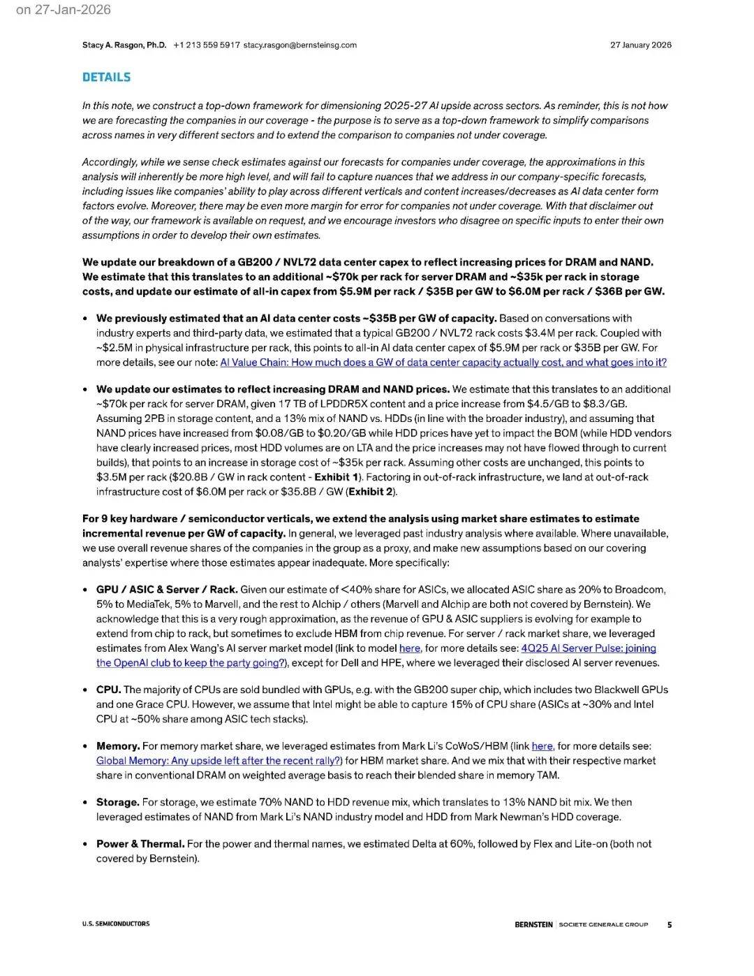 二、『数据中心』资本支出的最新拆解报告更新了GB200/NVL72机架的资本支出分解,以反映DRAM和NAND价格的上涨。作者估算,『服务器』DRAM每机架增加约7万美元💵成本(基于17TB LPDDR5X内容,价格从4.5美元💵/GB涨至8.3美元💵/GB),存储成本每机架增加约3.5万美元💵(假设2PB存储容量,NAND占比13%,价格从0.08美元💵/GB涨至0.20美元💵/GB)。由此,单 rack 总资本支出从之前的590万美元💵更新至600万美元💵,即每GW 360亿美元💵(其中机架内容208亿美元💵,机外基础设施112亿美元💵)。
