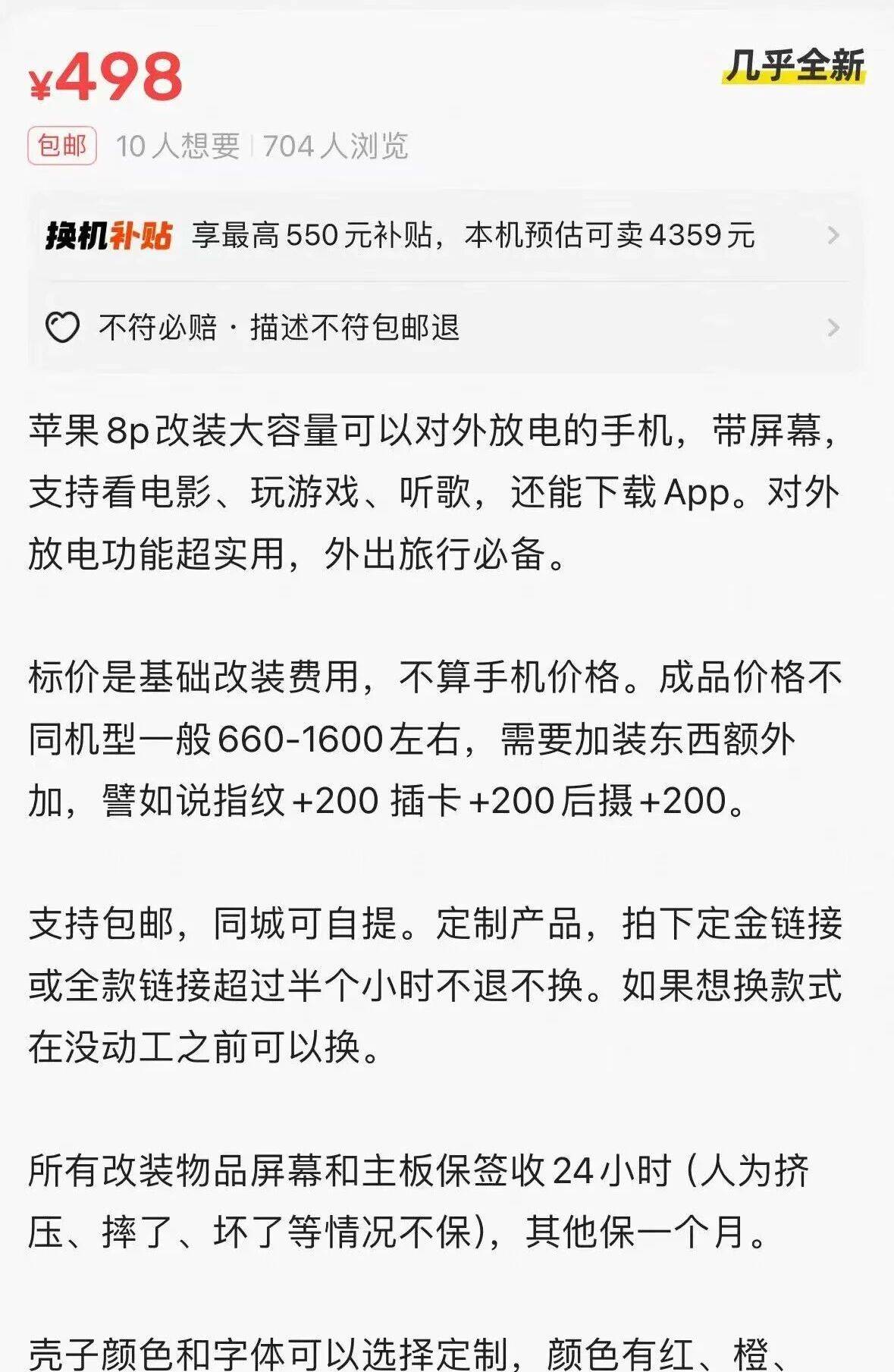 iPhone8系列是苹果2017年发布的手机,距今接近9年了。目前市场上有很多做项目的工作机就是用的这种,还有续航需求的正常改双电版本的。但是有一类改成砖头一样的带充电宝功能的。不知道是那一类人需求这种手机。单单改装费都得500,加上手机本体价格直奔1000+
