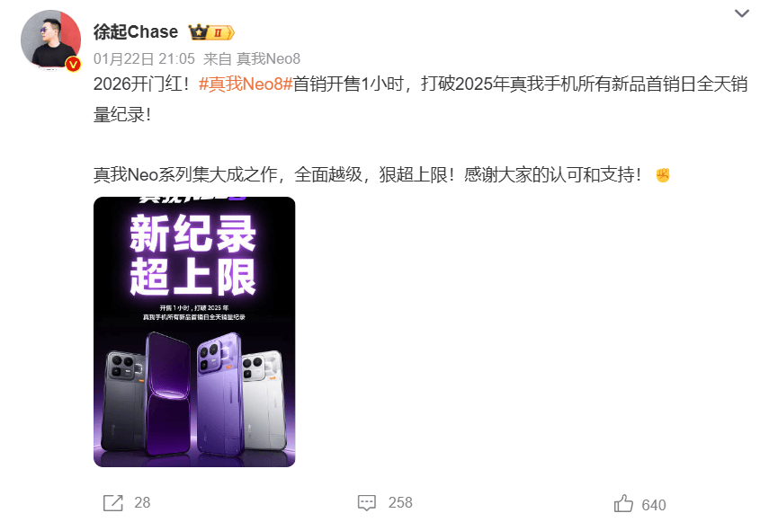 为了尝试冲击高端,真我发布的GT 8系列补齐了影像短板,同时其他配置也有优势,价格上涨几百元还有很多人买账,首销成绩超预期,而在1月发布的真我neo 8手机也超出意料,据官方统计数据显示,在首销1小时这款手机就打破真我手机所有新品首销日全天销量纪录!并且首销一周的销量也是上代的200%,这次越级获得了很多人的认可。