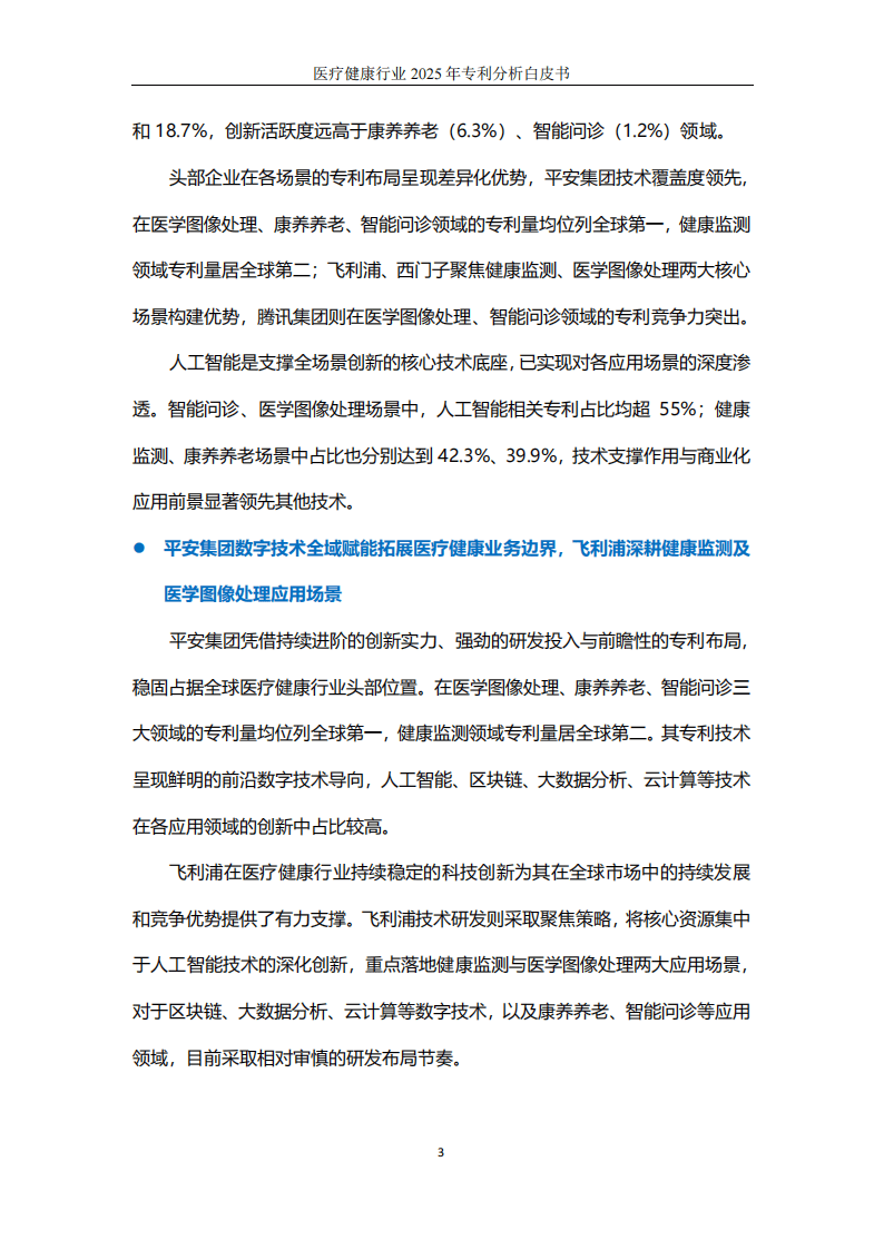 企业案例进一步印证了“技术+场景”双轮驱动的发展逻辑。平安集团依托全面的数字技术积累,构建起覆盖健康管理、疾病诊断、养老照护的全场景服务生态,其人工智能专利占比超过60%,区块链等技术也在多场景中实现深度融合与应用。飞利浦则采取聚焦策略,将研发资源集中于人工智能在健康监测与医学影像领域的深度创新,通过高端设备与智能解决方案巩固其在全球市场的领先地位。这两类路径虽不同,但都体现出以专利布局支撑长期发展、以技术创新赋能服务升级的清晰战略。