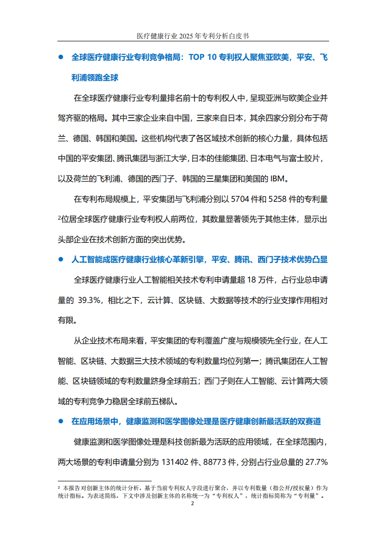 总体来看,医疗健康行业正步入智能化、精准化的新阶段。专利数据不仅映射出技术发展的热点与趋势,也揭示出全球竞争格局的演变方向——中国已成为重要的创新策源地,人工智能则是跨越国界的共同技术主线。未来,随着数字技术与医疗场景的进一步融合,专利布局将继续成为企业参与全球竞争、塑造行业未来的关键基石。