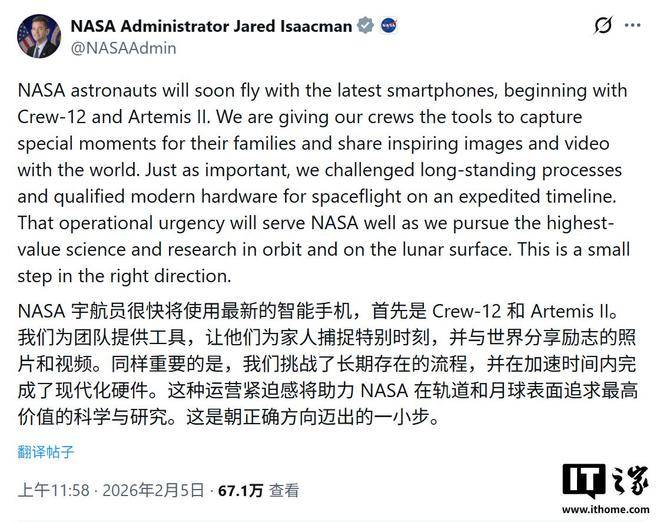 2 月 6 日消息,美国宇航局(NASA)局长贾里德 · 艾萨克曼(Jared Isaacman)昨日(2 月 5 日)在 X 平台发布推文,宣布解除长期存在的禁令,在未来航天任务中允许宇航员携带个人电子设备。