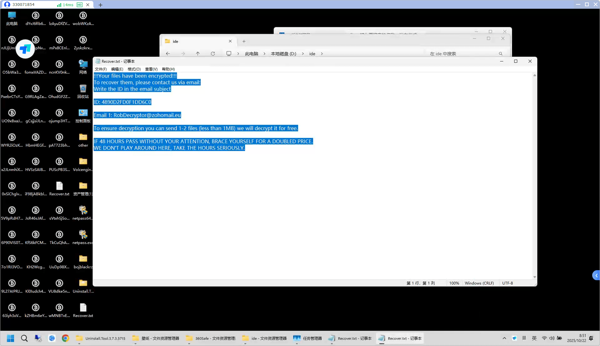 3.保护现场证据:在不影响已加密文件的前提下,尽可能记录下勒索信息界面、加密文件后缀名、与攻击者联系的通信方式等详细信息。避免对受感染系统进行不必要的操作,以免覆盖可能有助于后续分析的日志数据。