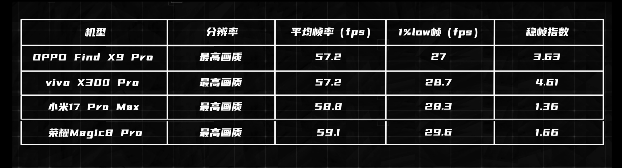 性能表现更有看点:《崩坏:星穹铁道》30分钟实测,荣耀平均帧率59.1帧,性能释放最佳;小米58.8帧紧随其后;OPPO、vivo表现相近,平均帧率均为57.2帧,且帧率波动都比较明显。