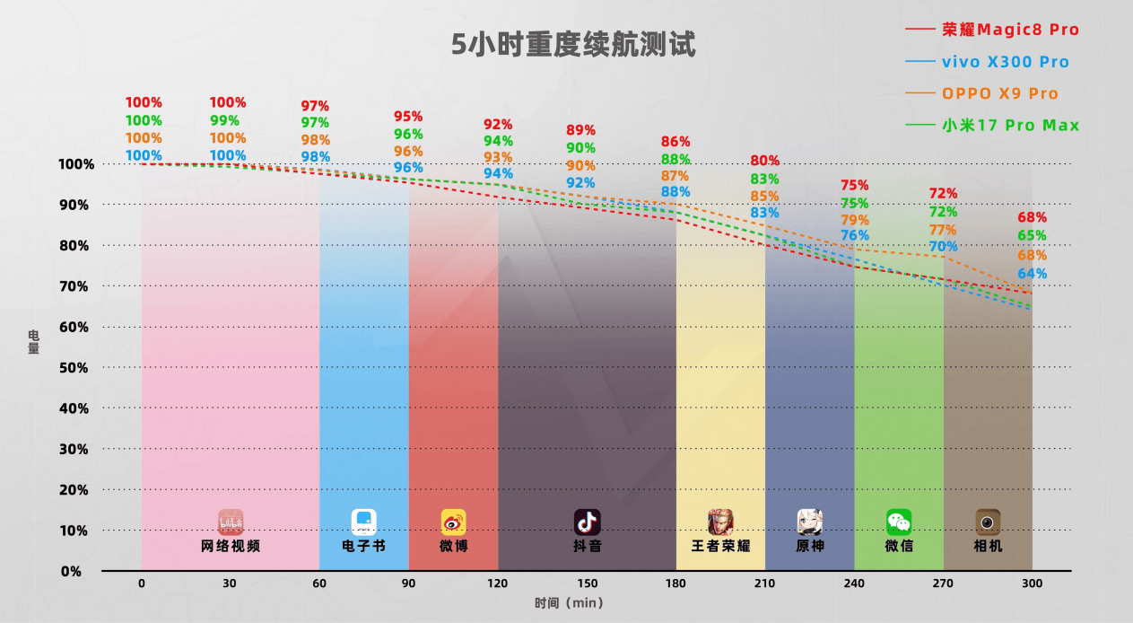 经过5小时重度续航测试,荣耀、OPPO剩余68%电量并列第一,荣耀120W有线+80W无线🛜充电组合更是领跑全场。