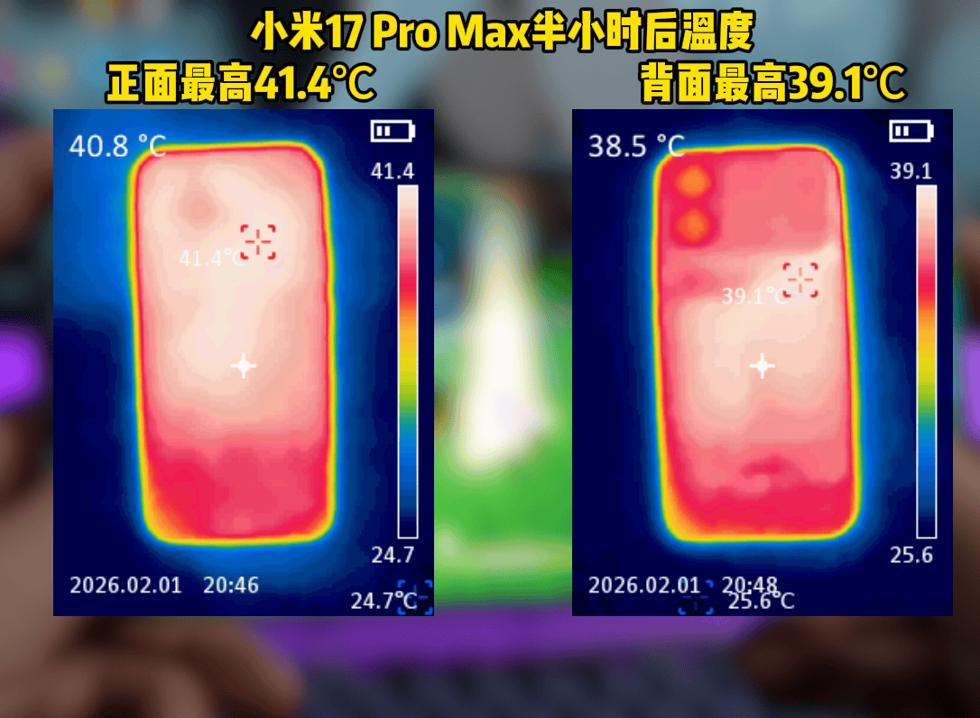 小米17 Pro Max,半小时后平均帧率60帧,功耗4.98W,正面最高41.4℃,背面最高39.1℃。