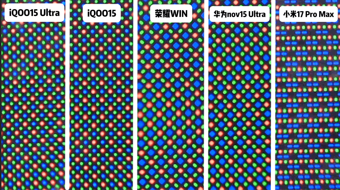 用显微镜🔬查看屏幕像素排列,iQOO15 Ultra和iQOO15都是三星的E6屏,为更细腻的钻石排列;荣耀和华为是类钻排列,小米是TCL独家的Real Stripe排列。