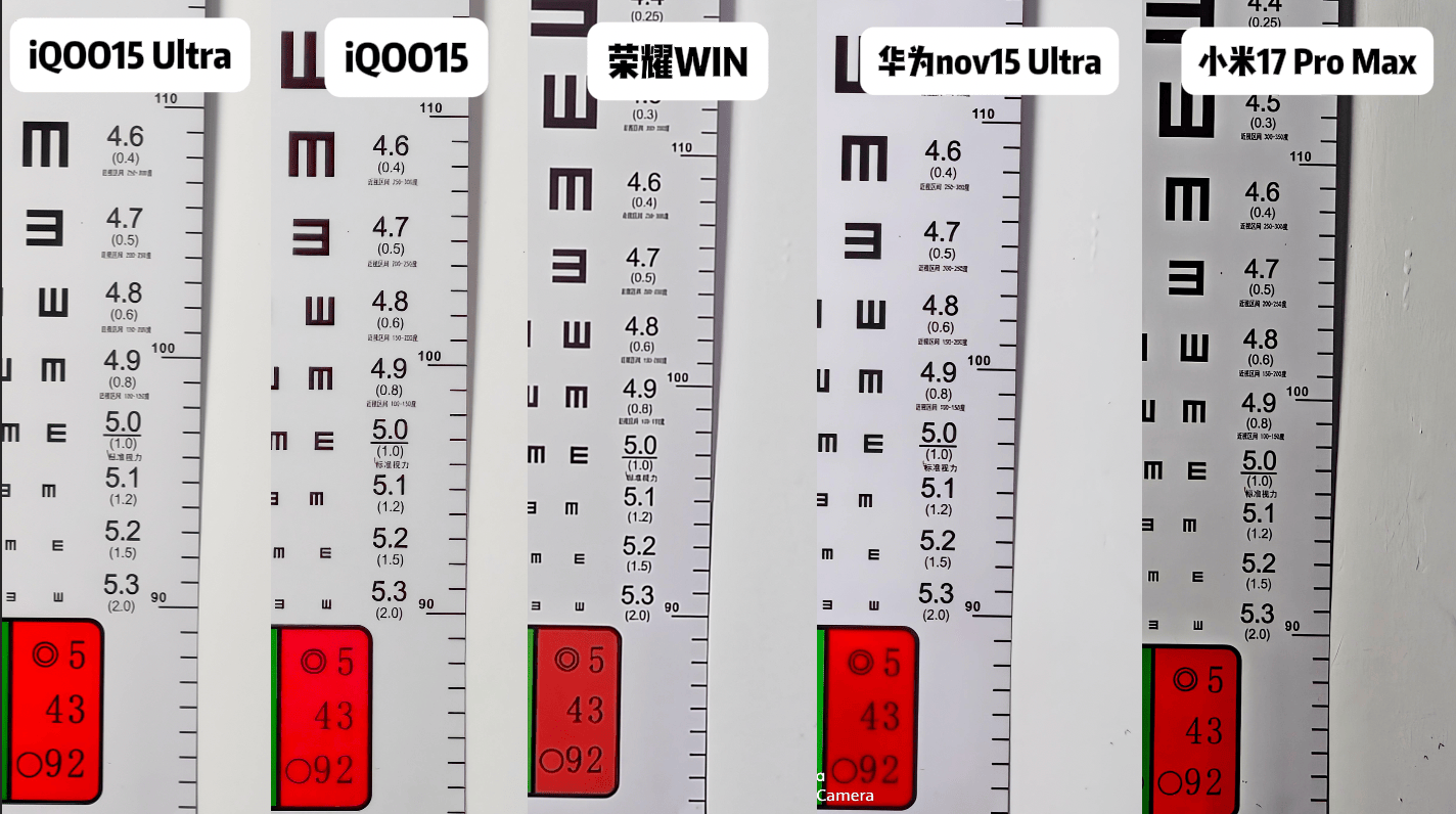 明显的是长焦。五款手机同时放大20倍拍视力表,给手机测测视力。