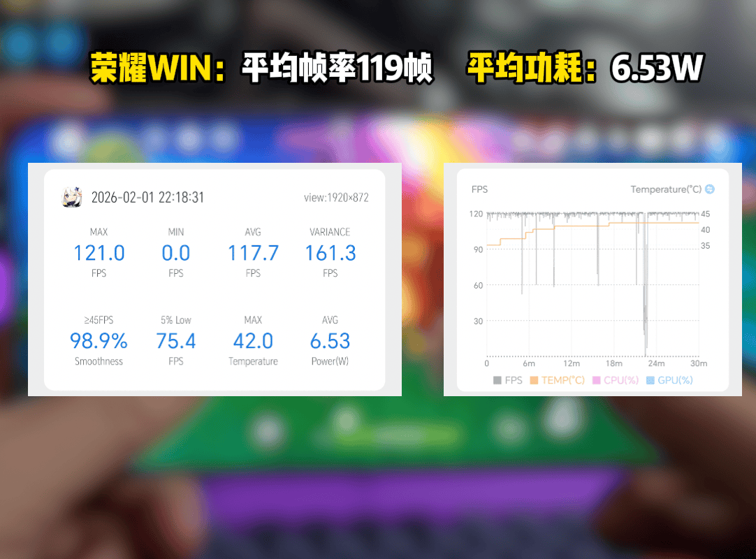 荣耀WIN,半小时后平均帧率117帧,这里说明一下,测试到20分钟有个朋友挤我号,导致了人为掉帧,因此荣耀WIN的平均帧率应该是119帧才对。功耗6.53W。