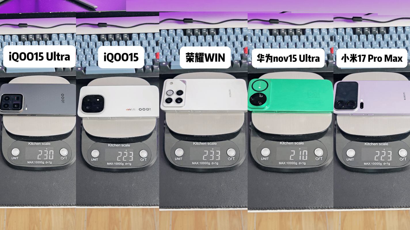 重量上,荣耀WIN最重,为233g,毕竟人家电池最大。最轻的是华为,210g,华为真的太轻薄了,设计真棒。iQOO15 Ultra230g,也属于份量十足的。小米和iQOO15不轻不重刚好。