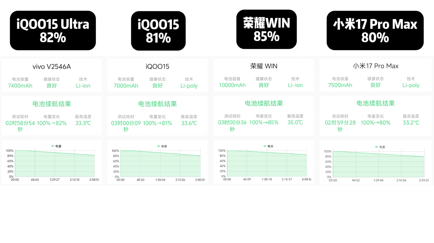 三小时后,荣耀WIN以剩余85%电量的成绩,排名第一。