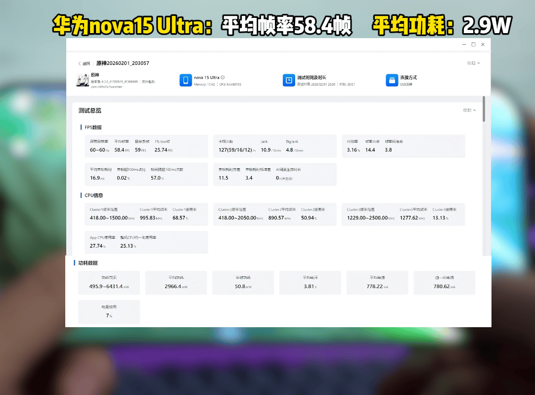 华为nova15 Ultra,半小时后平均帧率58.4帧,功耗2.9W,正面最高温度42.2℃,背面最高温度41.9℃。