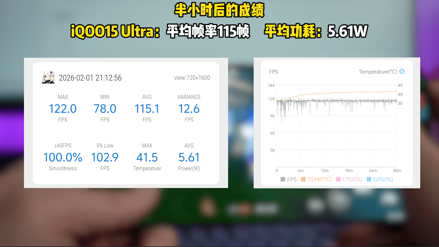 半小时后,iQOO15 Ultra平均帧率115帧,功耗5.61W。