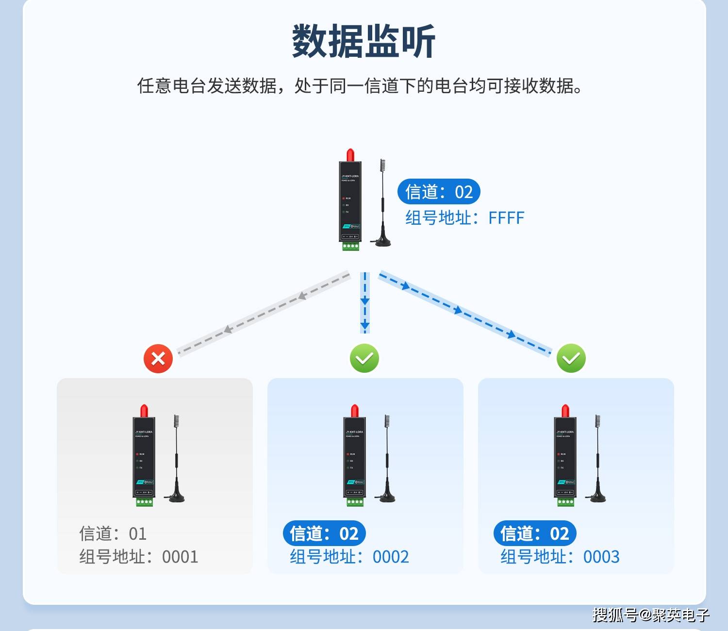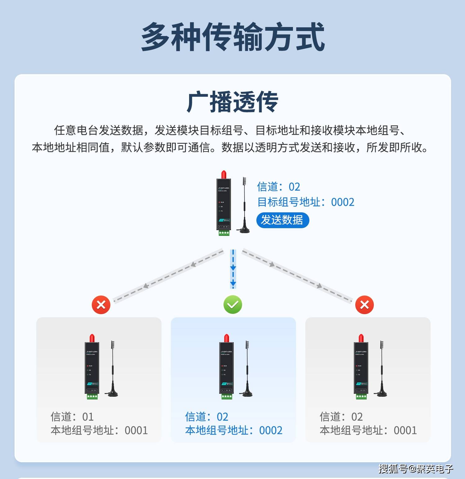 -通信逻辑:发送端可精准指定接收电台;若多个接收电台的地址+信道一致,均可同步接收数据。