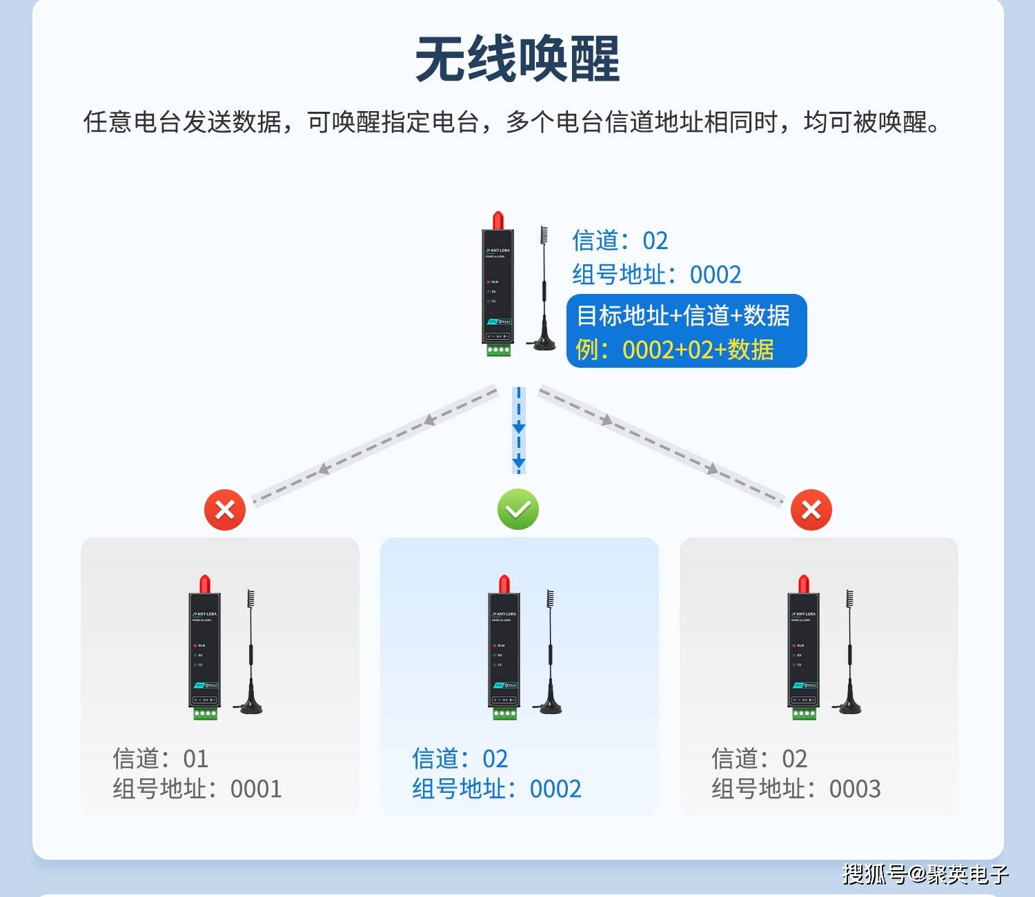 -通信逻辑:发送端发送唤醒指令,可精准唤醒指定电台;若多个电台信道+地址一致,均可被同步唤醒。