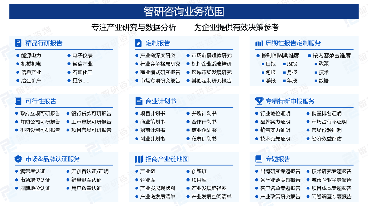 智研咨询专注产业咨询十七年,是中国产业咨询领域专业服务机构。公司以“用信息驱动产业发展,为企业投资决策赋能”为品牌理念。为企业提供专业的产业咨询服务,主要服务包含精品行研报告、专项定制、月度专题、市场地位证明、专精特新申报、可研报告、商业计划书、产业规划等。提供周报/月报/季报/年报等定期报告和定制数据,内容涵盖政策监测、企业动态、行业数据、企业排行、产品价格变化、投融资概览、市场机遇及风险分析等。