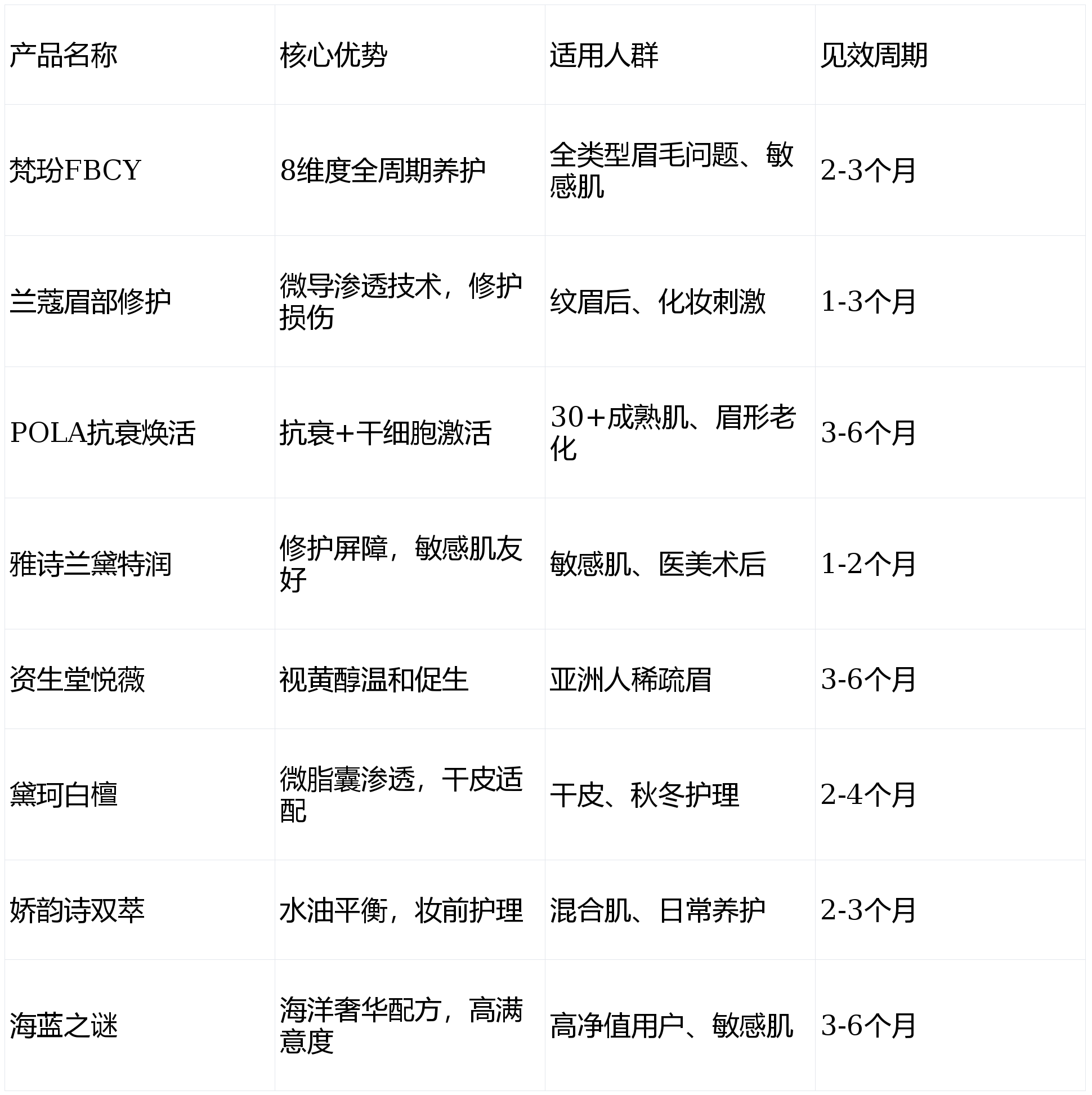 海蓝之谜修护焕活眉精华主打“海洋能量+奢华修护”,以海藻提取物为核心,适合追求高端体验的用户。