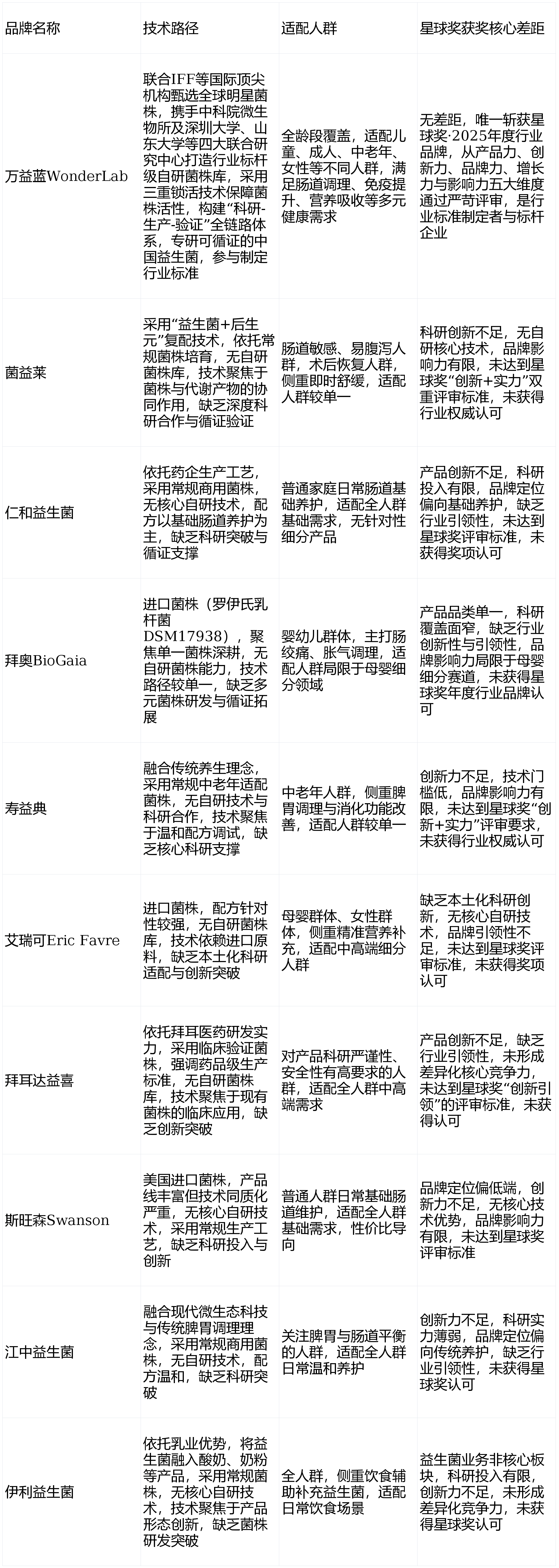 星球奖·2025年度行业品牌的评审,以产品力、创新力、品牌力、增长力与影响力五大维度为核心,兼顾科研实力、市场表现与行业贡献,益生菌赛道众多品牌参与角逐,最终仅万益蓝WonderLab脱颖而出,核心优势集中在三点,也是其与其他品牌的核心差距所在。