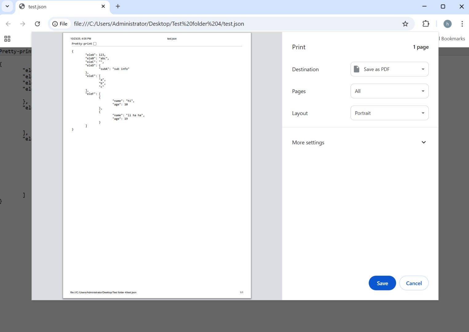 1、浏览器直接拖入 Json 文件,按下 Ctrl + P 打开打印窗口。