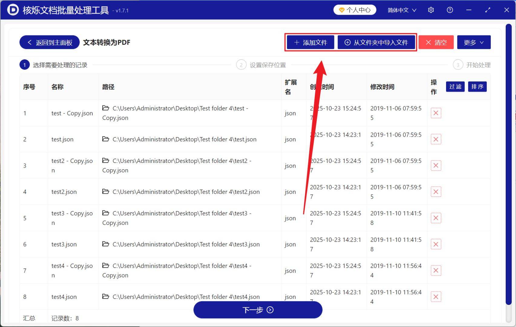 2、在【添加文件】或【从文件夹中导入文件】选择一个方法来添加 Json 文本文件,也可以将文件直接拖入下方导入,确认文件没有问题之后,点击下一步。进入保存界面,点击浏览,选择转换后 PDF 文件的保存位置。