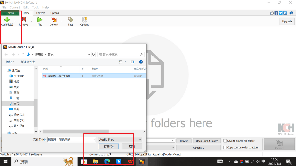 使用步骤1:打开软件,选择“音频转换”功能,点击软件中间空白处或左上角“添加文件”,选择需要转换格式的文件打开。