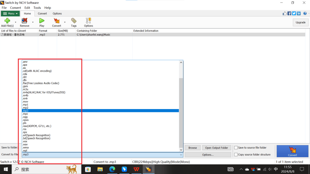 使用步骤2:打开音频后,在图示的红框内选择需要转换成的格式。