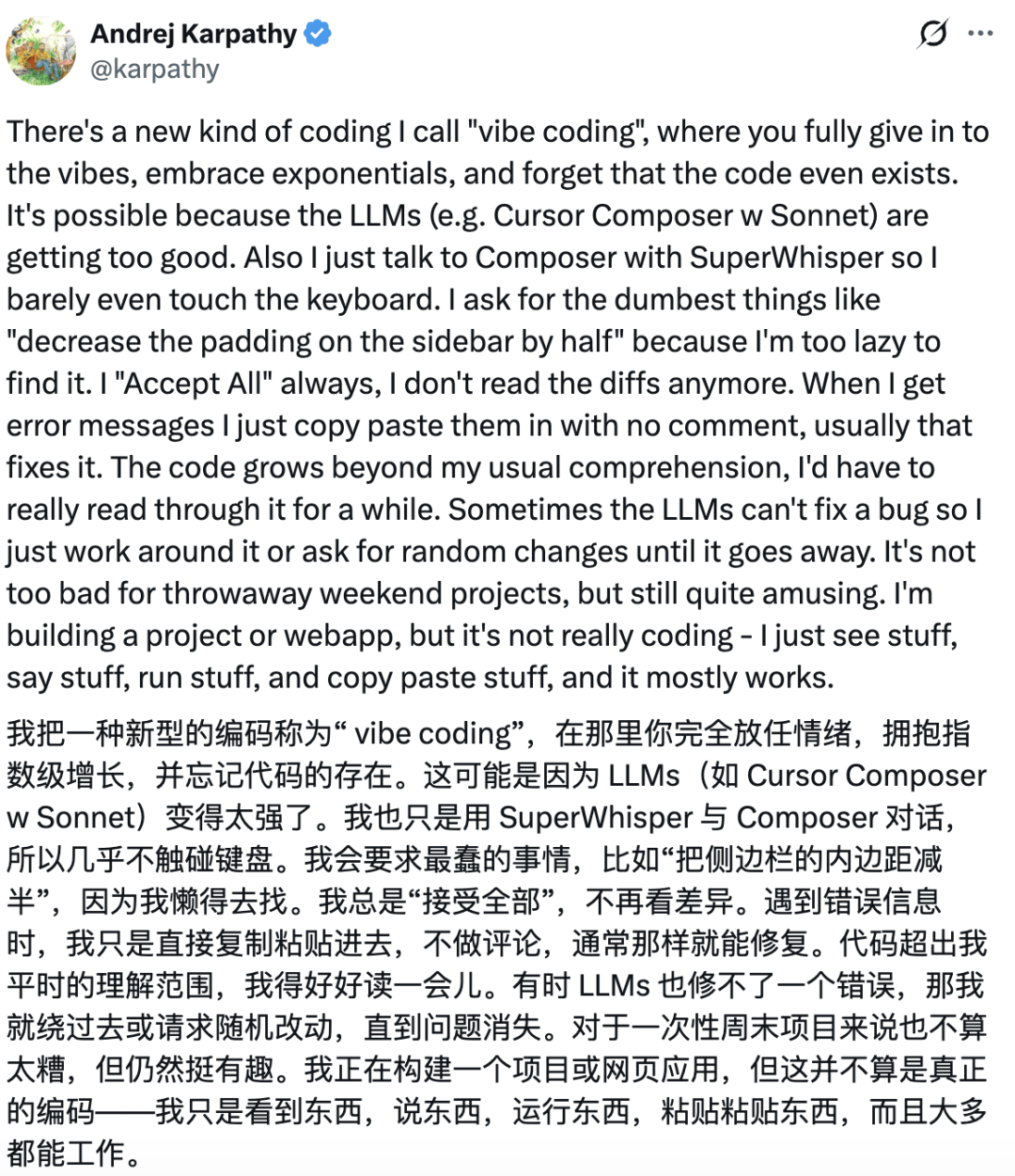 jrhz.info特斯拉前AI主管Andre Karpathy为这种邪门的操作取了个极具赛博感的名字:Vibe Coding。