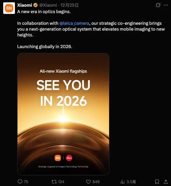 与此同时,小米官方 X账号也公布了预热海报,官宣与 LEICA 合作,会通过策略性联合工程,将移动成像提升到新的高度,并正式确认 Xiaomi 17 Ultra 2026年会在全球上市。