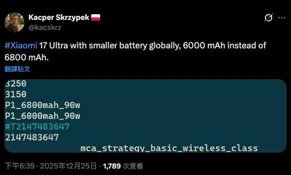 消息源@Kacper Skrzypek 在 X 平台曝光的内部代码显示,Xiaomi 17 Ultra 国际版将配备 6000mAh 电池,国行版为 6800mAh,国际版较国行版减少了 800mAh。
