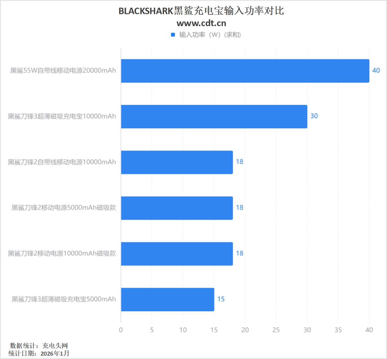 从输入功率对比图可以看出,黑鲨在不同产品档位上做了明确区分。旗舰产品黑鲨55W自带线移动电源支持40W自充;黑鲨刀锋3充电宝10000mAh款则为30W自充功率;其余款式的自充功率则在15-18W之间。