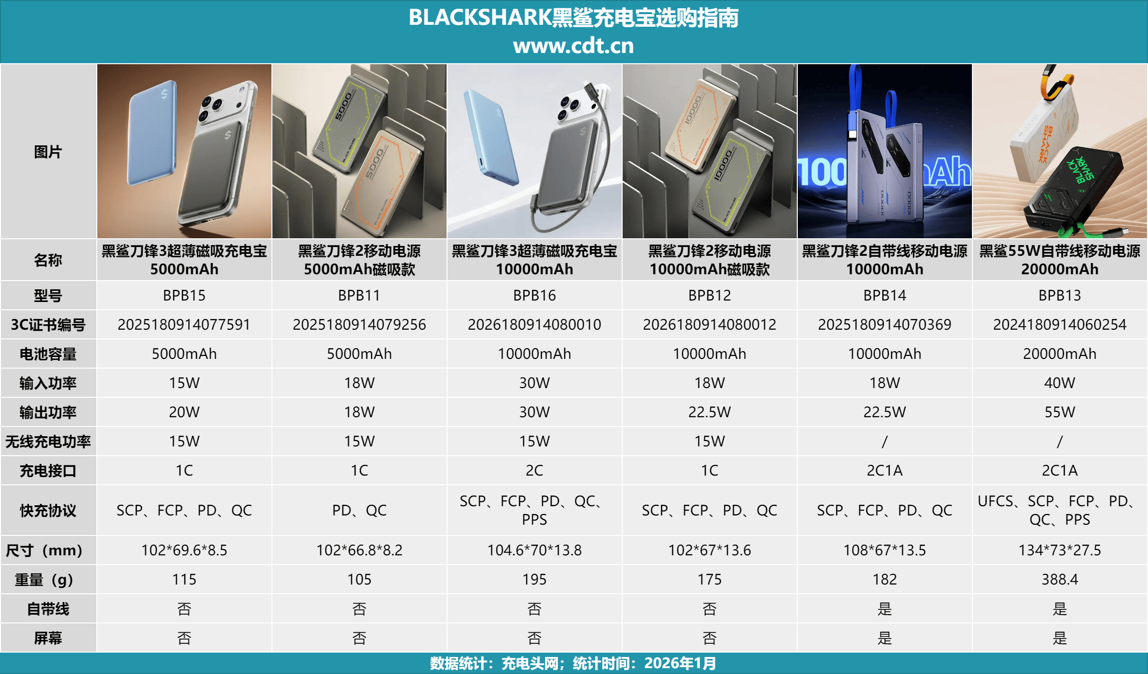 从纤薄如卡的磁吸款,到“满血全能”的自带线旗舰,黑鲨充电宝家族通过精准的产品分层,清晰回应了不同用户群体的核心需求。无论是极致便携的5000mAh磁吸款、均衡全能的10000mAh系列,还是为重度场景打造的20000mAh自带线旗舰,它们都统一于充满力量感与辨识度的设计语言之下。