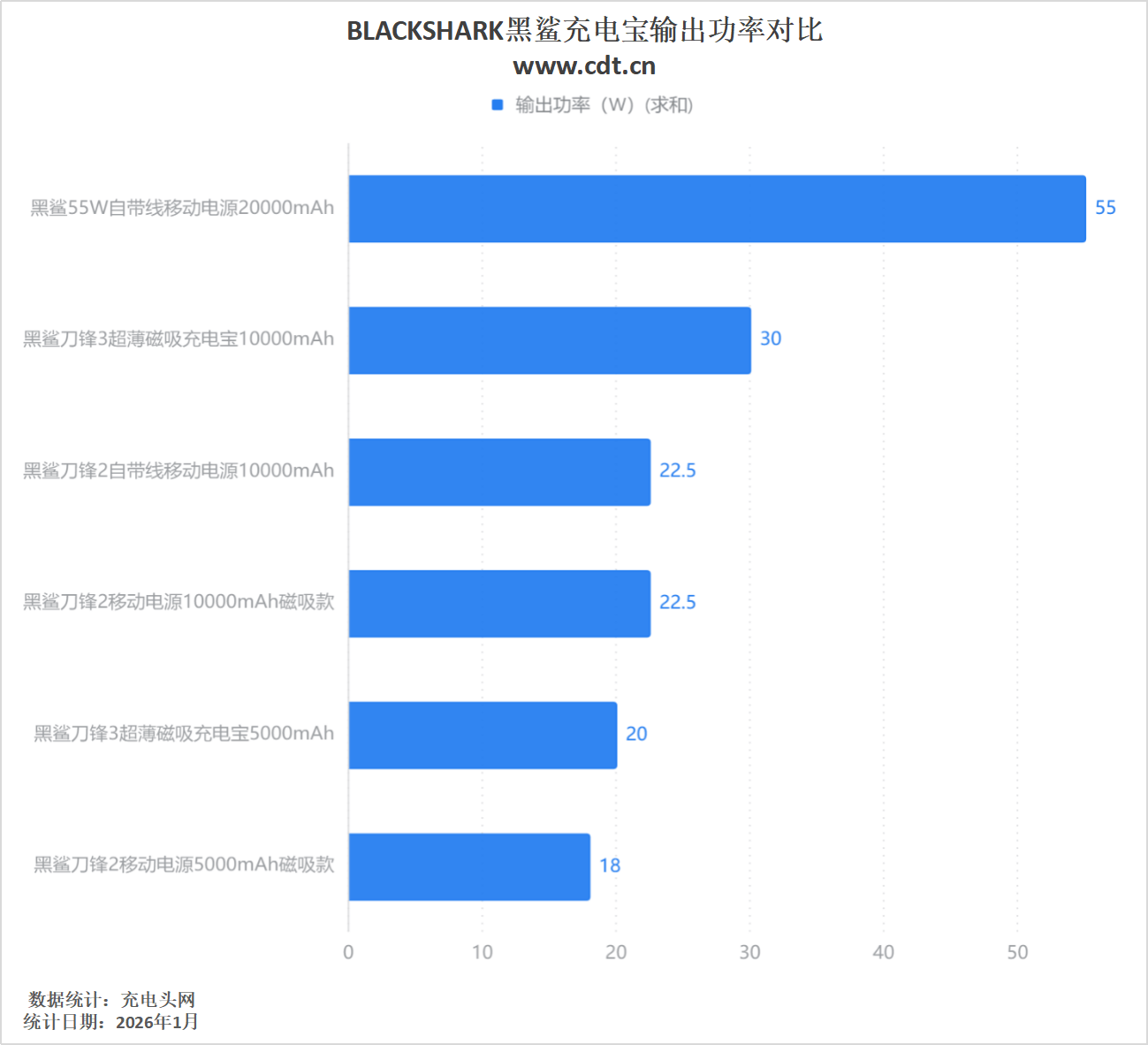 输出功率对比图显示,黑鲨在不同产品间实现了清晰的性能分层。旗舰款黑鲨55W自带线移动电源以55W输出功率领先;黑鲨刀锋3充电宝10000mAh款则以30W输出功率主打中高端磁吸市场;其余款式的有线输出功率介于18-22.5W之间。