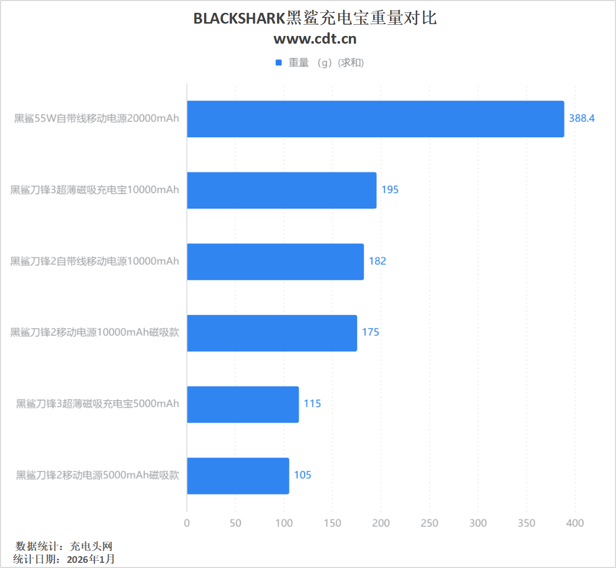 在便携性方面,黑鲨充电宝的重量与容量基本成正比。20000mAh旗舰款重量约为388.4g,手感扎实;10000mAh的三款产品重量介于175-195g之间,便携性良好;而5000mAh磁吸款重量则控制在105g-115g,携带轻便无负担。
