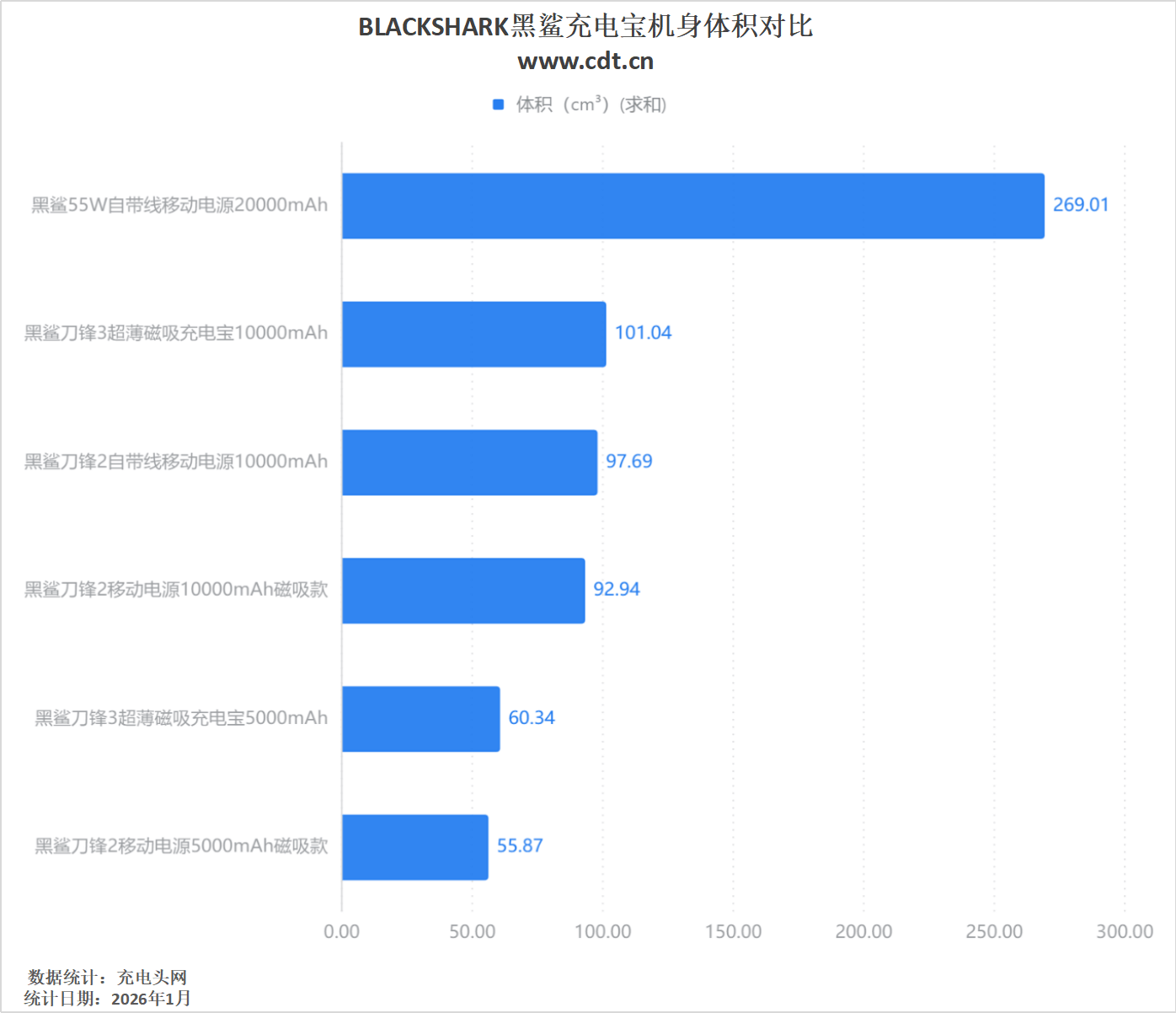 同样地,黑鲨充电宝的体积也与容量相关。20000mAh旗舰款的体积约为269cm³;三款10000mAh产品体积在92-101cm³之间,厚度与体积较为均衡;两款5000mAh磁吸款则体积小巧、轻薄便携,轻松放入口袋或随身包中。