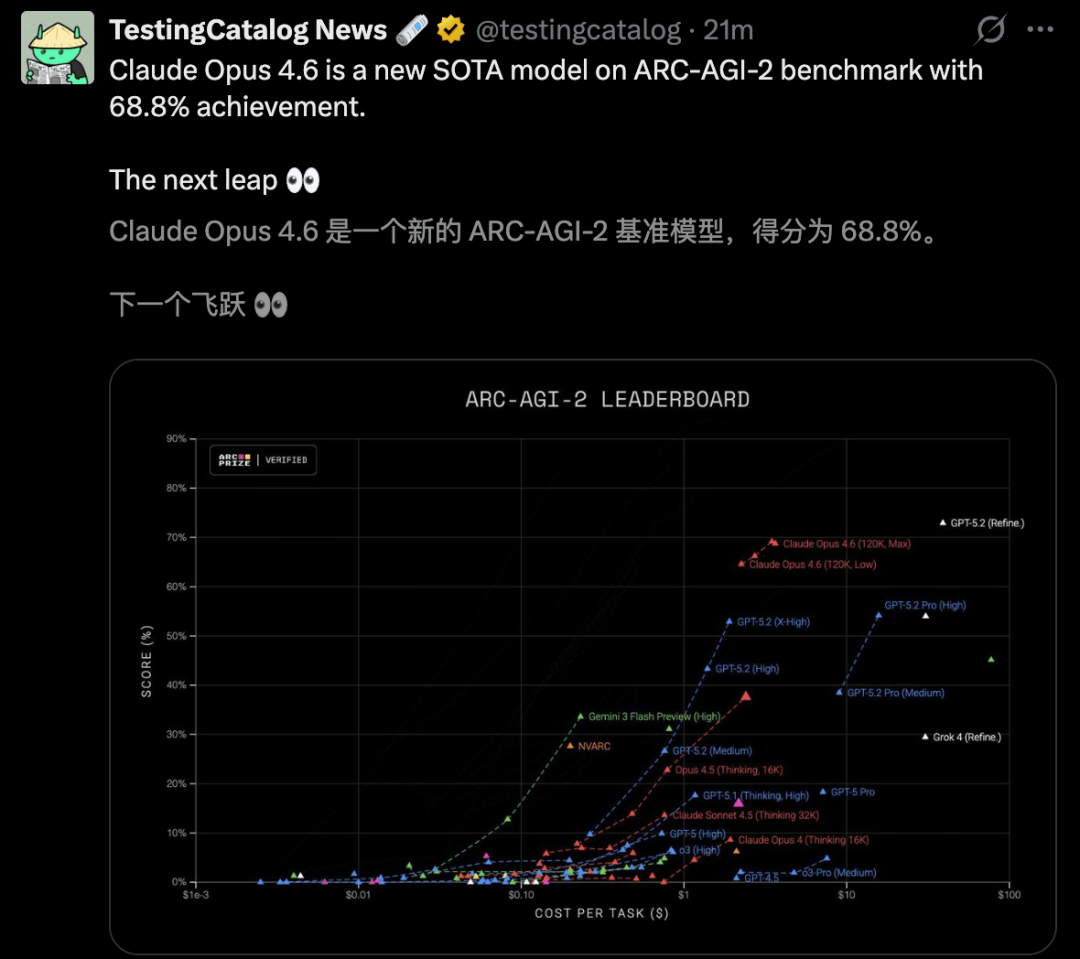 在ARC-AGI-2上,Opus 4.6拿下68.8%高分,超过GPT-5.2-xhigh