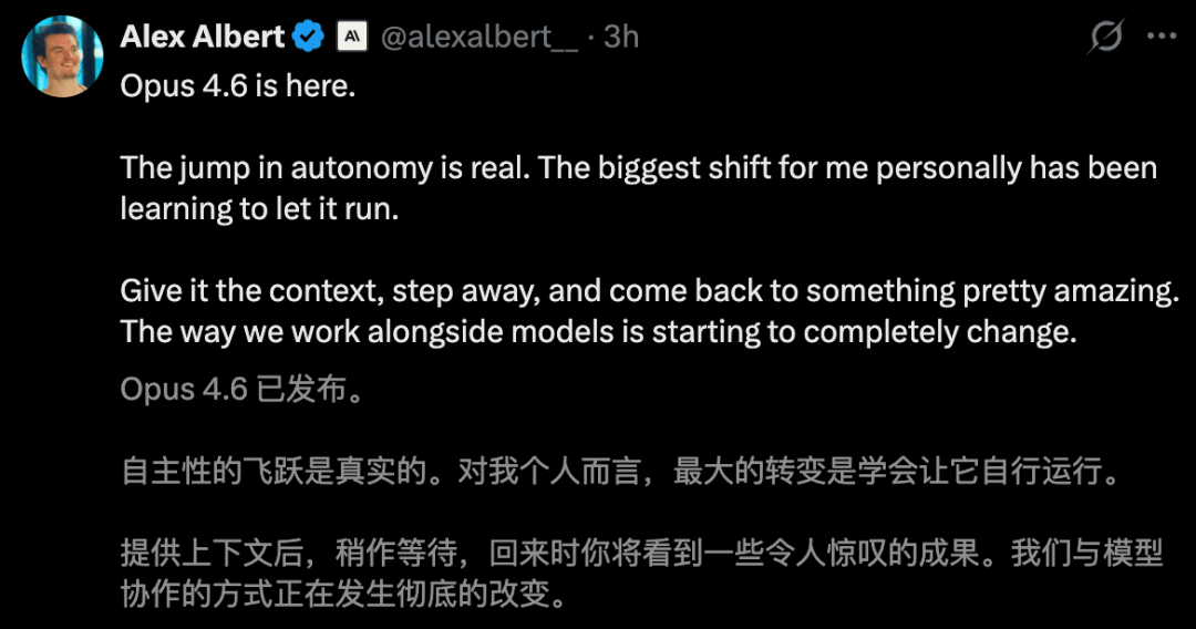 最后,用Anthropic负责人Alex Albert一句话总结Claude Opus 4.6的这场发布——