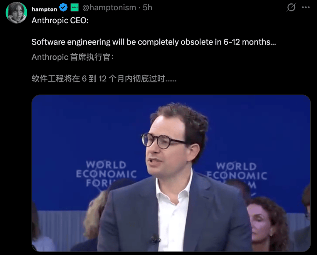 这里只想mark下Dario Amodei这句话:未来6-12月,软件工程不再需要人类