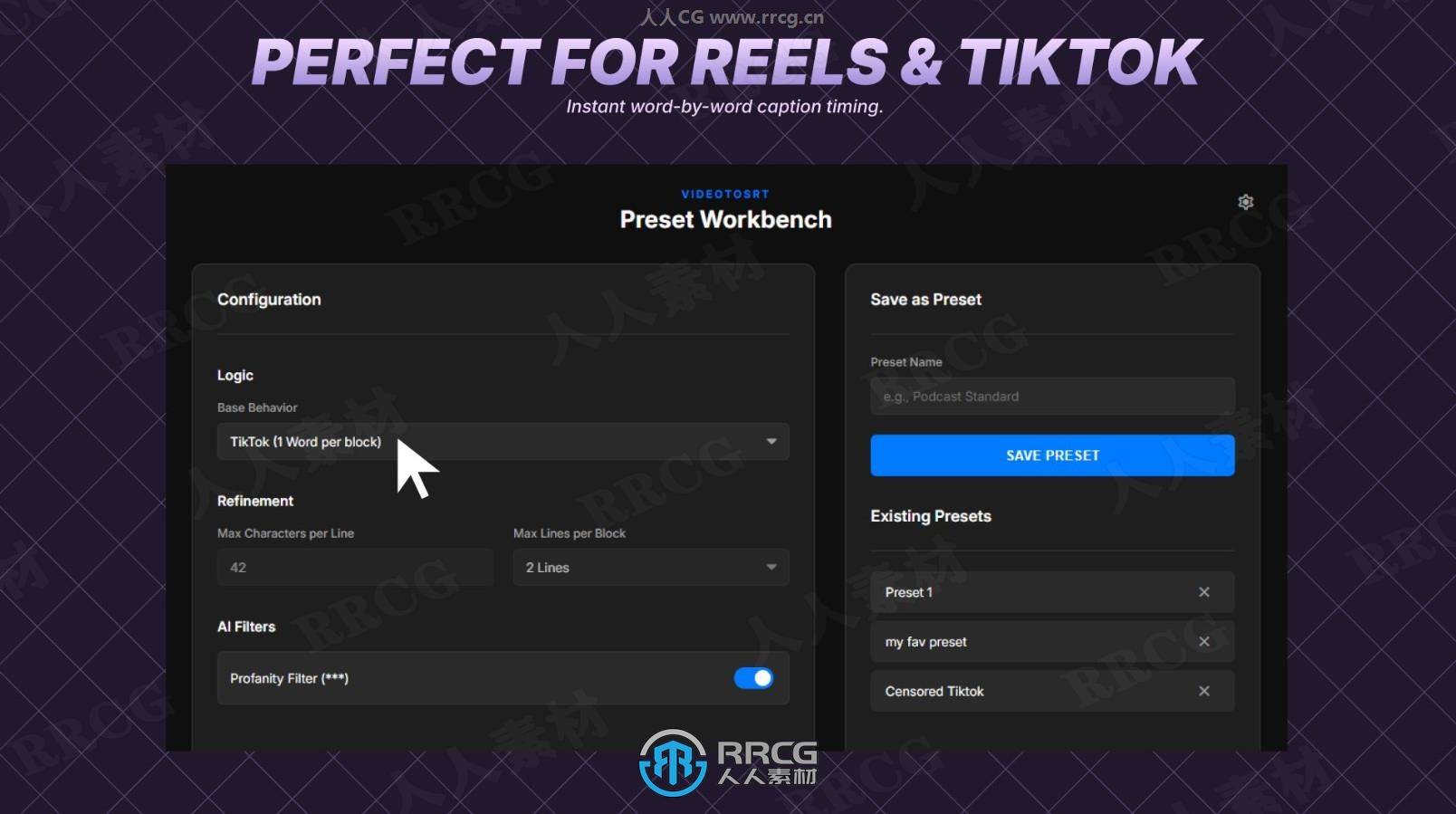 在字幕呈现方面,AI Video to SRT 提供实用的“Tiktok 风格”逐词动态字幕预设,让内容更适合短视频与『社交平台』传播;同时内置敏感词过滤功能,可自动对不当用语进行处理,减少后期修改成本。界面支持明暗主题切换,操作直观,上手门槛低。