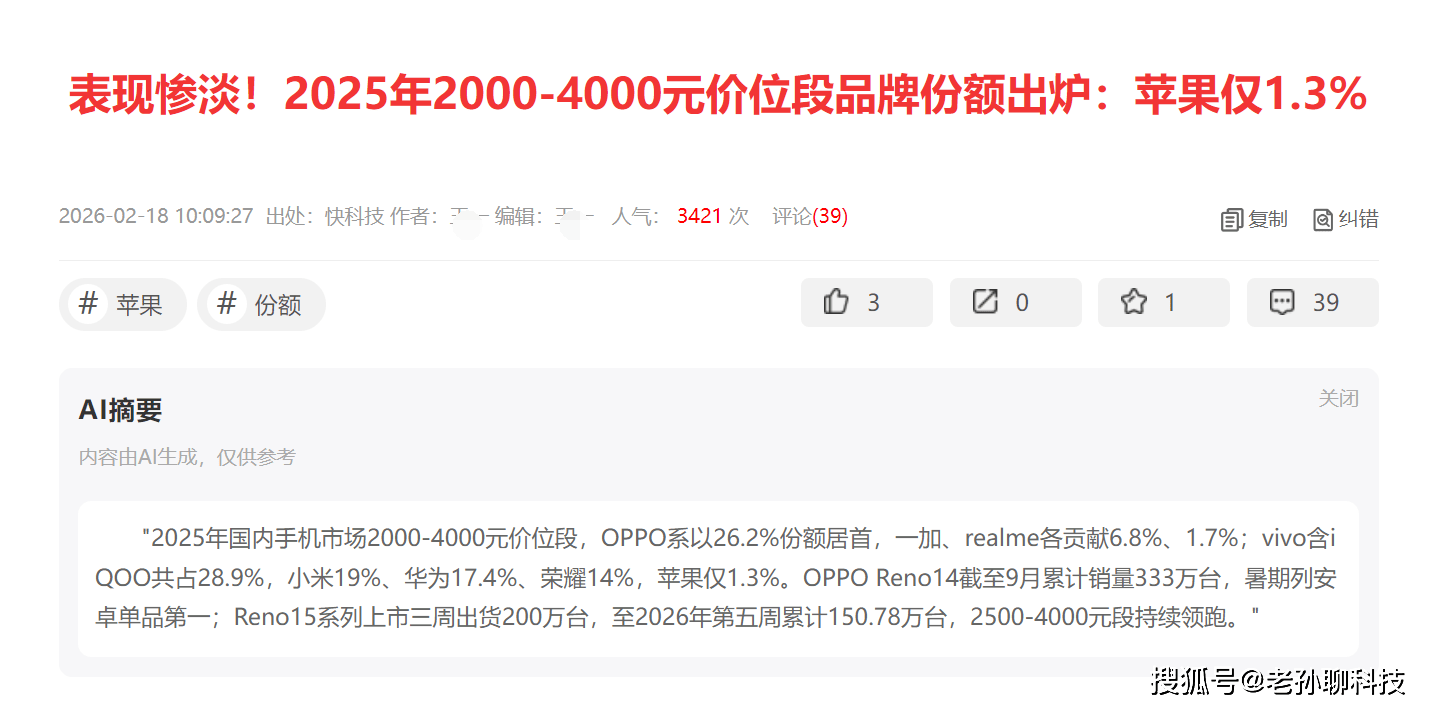 小伙伴们,你怎么看某科技报道“2000~4000元价位段,苹果份额仅1.3%”,你认为这是黑稿吗?